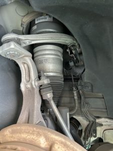 自社で使用しているベンツの右フロントの車高が下がる症状でており点検をした所エアサスから空気が漏れて車高を維持出来ない事が確認できました。